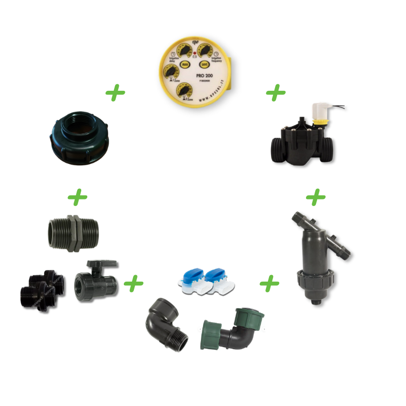 Gravitacinis laistymo rinkinys iš IBC konteinerio - tai išbaigtas, profesionalus sprendimas tiems, kurie nori automatizuoti laistymą be elektros tinklo ir be brangių montavimo darbų. Rinkinys sukurtas taip, kad visi komponentai tiksliai tarpusavyje derėtų - jums nereikia ieškoti atskirų dalių, tikrinti suderinamumo ar gaišti laiką derinant skirtingus elementus. Viskas, ko reikia, jau yra vienoje dėžėje.
