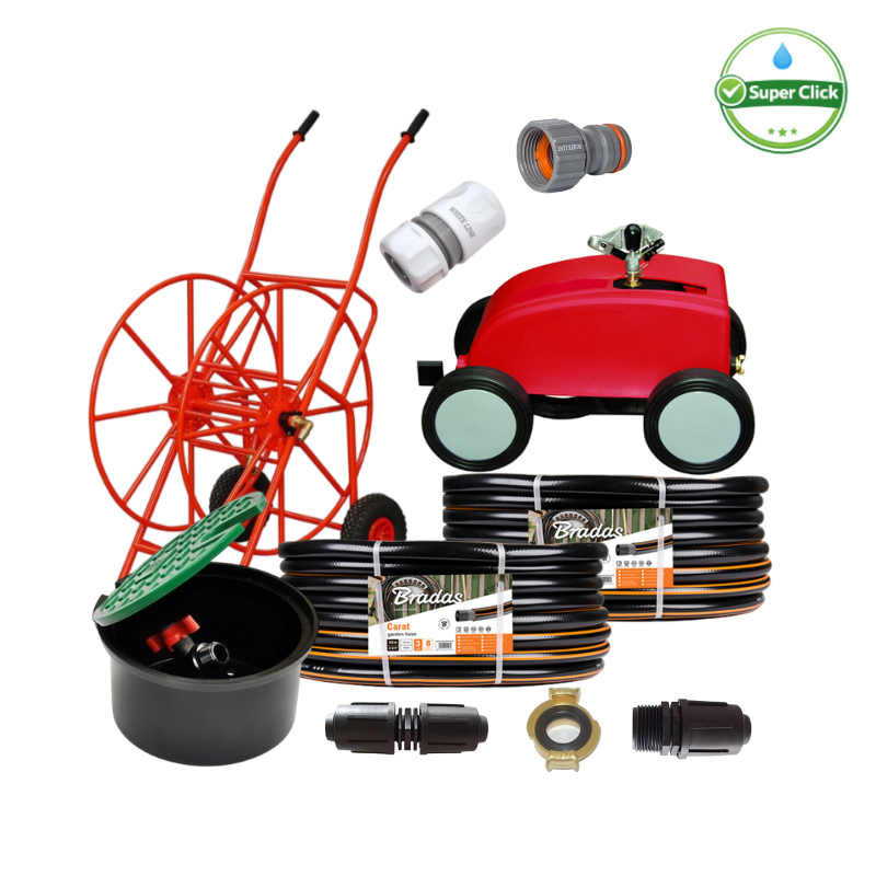 Laistymo rinkinys virš 50 arų - greitai prijungiama, mobili laistymo sistema, skirta tiems, kurie nori sutaupyti laiko, nenori atlikti didelių kasimo darbų ir ieško efektyvaus bei patogaus laistymo sprendimo didelėms vejos ar sodo teritorijoms. Šis rinkinys išsiskiria PERROT Rollcart V3 savaeigiu purkštuku, kuris judėdamas tik tiesiai pagal ištiestą trosą. Pasiekus paskirtą plotą, laistymo įrenginys automatiškai sustabdo vandens tekėjimą ir laistymą. Už vežimėlio traukiama 1“ laistymo žarna. Super Click sistema virš 50 arų – tai pažangi, mobiliai naudojama laistymo sistema, skirta didelėms teritorijoms. Sistema sukurta taip, kad ją būtų galima greitai prijungti prie vandens šaltinio, nereikalaujant sudėtingo montavimo ar didelio kiekio požeminių vamzdynų.